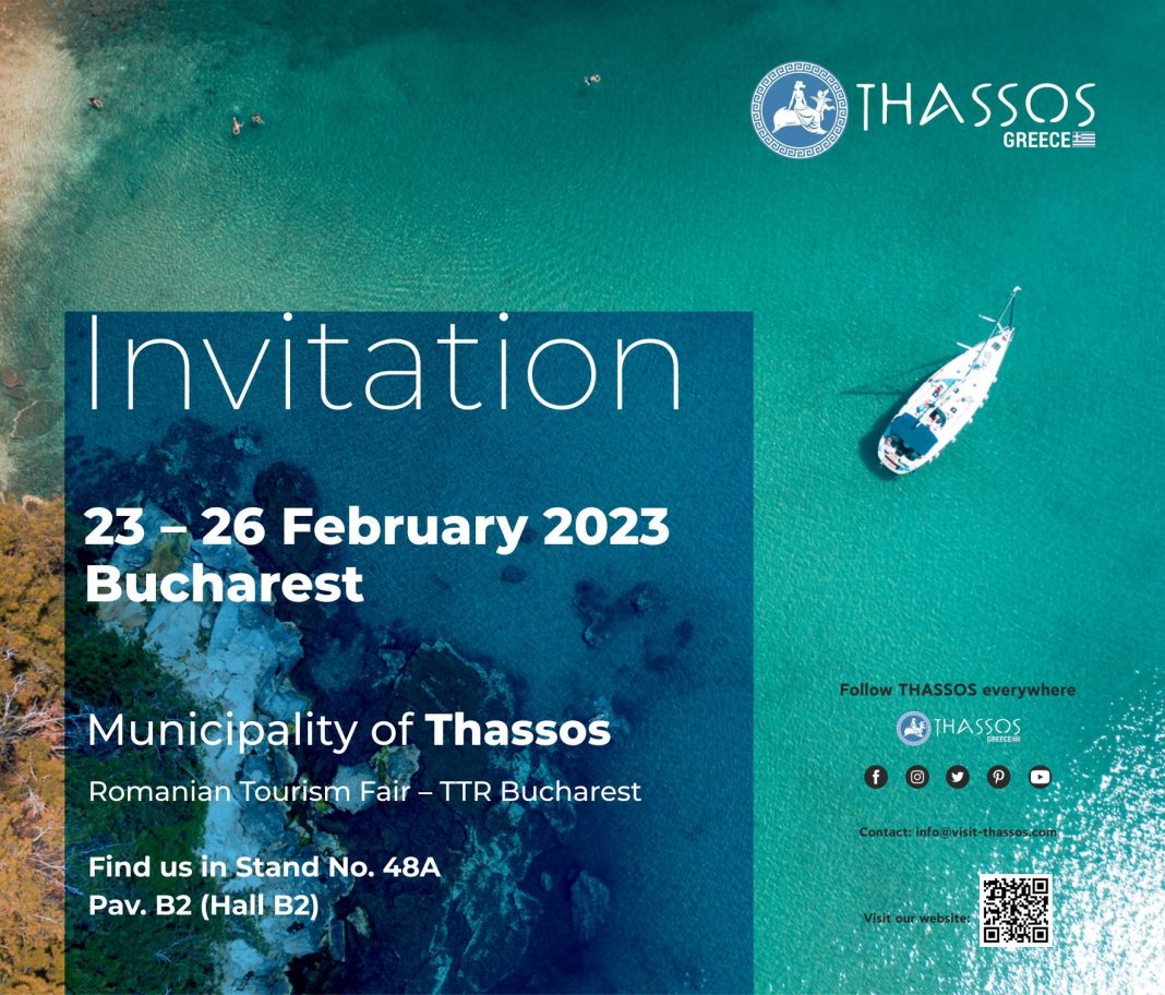 Ο Δήμος Θάσου, όπως αναφέρει δελτίο Τύπου, συνεπής στην δέσμευση να συνδράμει με κάθε πρόσφορο μέσο στην προβολή του τόπου, θα συμμετέχει και φέτος στην διεθνή τουριστική έκθεση TTR Bucharest 2023, που θα διεξαχθεί από 23 έως και 26 Φεβρουαρίου 2023 στο Βουκουρέστι της Ρουμανίας. Η έκθεση αυτή αποτελεί πόλο έλξης χιλιάδων επισκεπτών και εκπροσώπων της τουριστικής βιομηχανίας και είναι μοναδική ευκαιρία για την προβολή της Θάσου, την προσέλκυση επισκεπτών και την δημιουργία σημαντικών επαφών και συνεργασιών με επαγγελματίες της τουριστικής βιομηχανίας της Ρουμανίας.