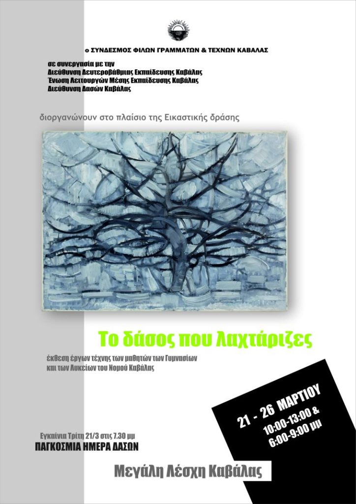 Ο Σύνδεσμος Φίλων Γραμμάτων και Τεχνών (Σ.Φ.Γ.Τ.) Καβάλας, σε συνεργασία με την Διεύθυνση Δευτεροβάθμιας Εκπαίδευσης Καβάλας, την Ένωση Λειτουργών Μέσης Εκπαίδευσης Καβάλας και την Διεύθυνση Δασών Καβάλας, διοργανώνουν έκθεση έργων τέχνης των μαθητών των Γυμνασίων και των Λυκείων του Νομού Καβάλας, στο πλαίσιο της εικαστικής δράσης: «το δάσος που λαχτάριζες». Η έκθεση θα φιλοξενηθεί στην Μεγάλη Λέσχη Καβάλας, θα εγκαινιαστεί στις 7:30 το απόγευμα της Τρίτης 21 Μαρτίου 2023, παγκόσμια ημέρα δασών και θα διαρκέσει έως την Κυριακή 26 Μαρτίου 2023. Θα λειτουργεί τις ώρες: 10:00-13:00 και 18:00-21:00, με ελεύθερη είσοδο για το κοινό. Όπως αναφέρει σχετικό δελτίο Τύπου, η εικαστική δράση αποσκοπεί στην δημιουργία ενός πνεύματος ενεργούς συμμετοχής, καλλιτεχνικής έμπνευσης και ζωτικής ενθάρρυνσης για τα παιδιά. Τα παιδιά ζωγραφίζουν, παίζουν, παροτρύνονται να ρωτήσουν, να ανακαλύψουν, να εκφραστούν καλλιτεχνικά, να θαυμάσουν την φύση, να την αγαπήσουν και να την προβάλλουν μέσα από τα δικά τους έργα. Ο τίτλος της δράσης προέρχεται από ποίημα του Μιλτιάδη Μαλακάση.