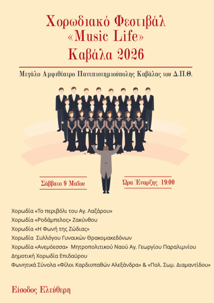 Ένα μουσικό γεγονός που υπόσχεται ν’ αγγίξει καρδιές και να μείνει αξέχαστο έρχεται για δεύτερη χρονιά στην Καβάλα! Το Σάββατο 9 Μαΐου 2026, το μεγάλο αμφιθέατρο της πανεπιστημιούπολης μεταμορφώνεται σε μία μεγάλη μουσική σκηνή και αναμένει τους Καβαλιώτες και τις Καβαλιώτισσες στην χορωδιακή γιορτή, με την συμμετοχή 7 εξαιρετικών χορωδιών από διάφορα μέρη της Ελλάδας και της Κύπρου. «Σε μία βραδιά, όπου η φωνή συναντά την ψυχή, το κοινό θα απολαύσει ένα πλούσιο ελληνικό ρεπερτόριο, με αγαπημένα έντεχνα και παραδοσιακά τραγούδια, που θα ζωντανέψουν μέσα από τις αρμονικές αποχρώσεις και τις πολυφωνίες των χορωδιών. Κάθε ομάδα φέρνει μαζί της την μουσική ταυτότητα του τόπου της, σε μία μαγική ανταλλαγή πολιτισμού και συναισθημάτων. Μία βραδιά που ενώνει κουλτούρες και καρδιές. Ελάτε να ζήσετε την μαγεία της συλλογικής έκφρασης, της μελωδίας και της συγκίνησης. Ελάτε να τραγουδήσουμε μαζί! Διοργάνωση: Χορωδιακά Φεστιβάλ Music Life. Είσοδος ελεύθερη», αναφέρει δελτίο Τύπου.