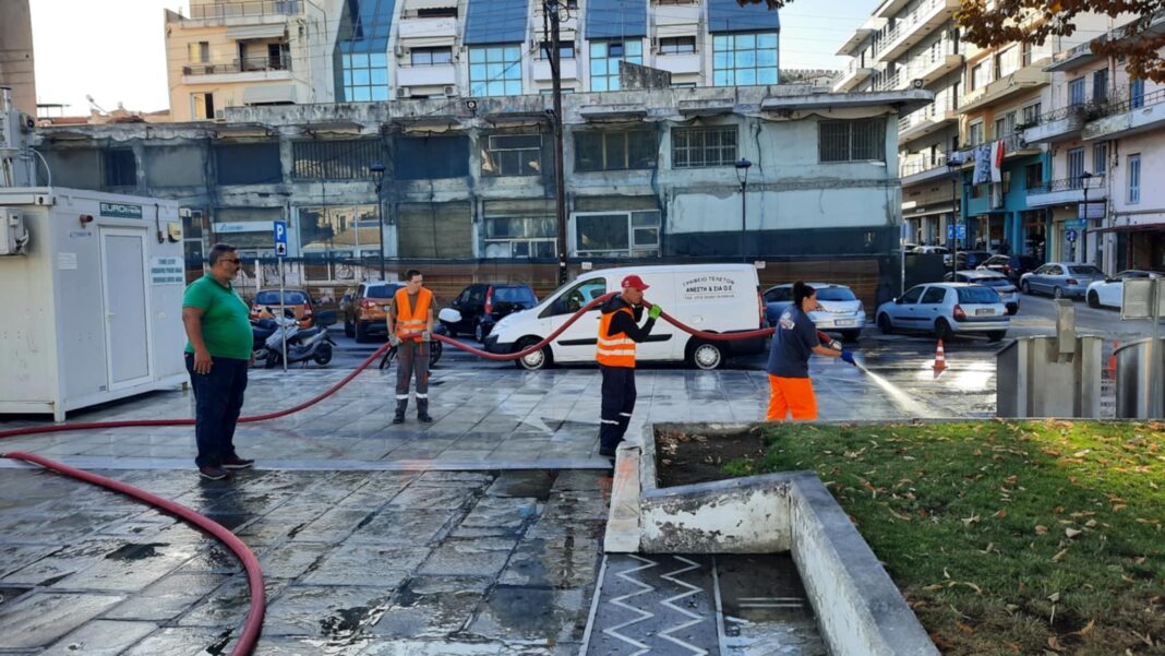 Με εντολή του αντιδημάρχου της Υπηρεσίας καθαριότητας Δήμου Καβάλας, Χρήστου Τσιτσιλικάκη και υπό την επίβλεψη των προϊσταμένου της Υπηρεσίας, Μπάμπη Παναγιωτίδη, μετά την απολύμανση των κάδων απορριμμάτων, απομακρύνθηκαν φύλλα και καθαρίστηκαν, με την χρήση πλυστικών μηχανημάτων, οι πλατείες Ελευθερίας και Κονσουλίδη, καθώς και το πάρκο δίπλα στο μνημείο των δασοκομάντος στην ιχθυόσκαλα.