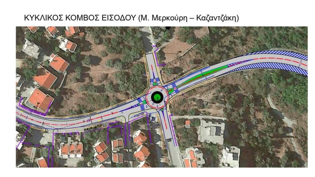 -Την κατασκευή τριών κυκλικών κόμβων στην είσοδο, την έξοδο και σε μία διασταύρωση).