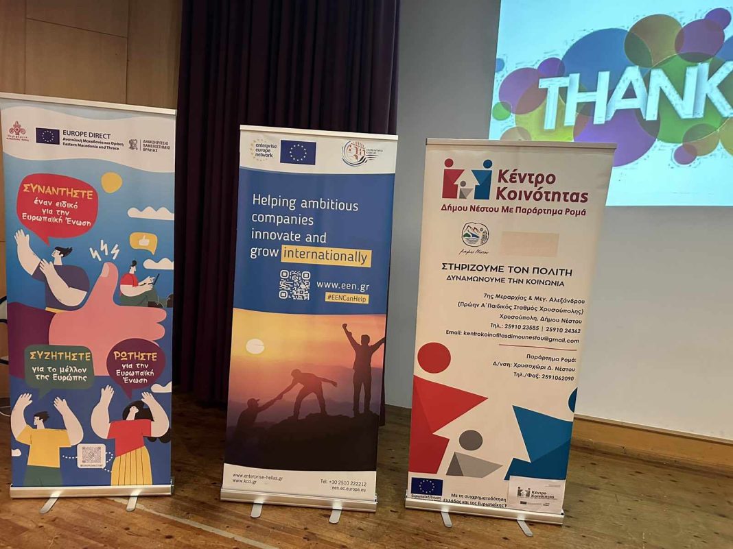 Την Πέμπτη 28 Μαρτίου 2024, το Europe Direct Ανατολικής Μακεδονίας-Θράκης, με το Κέντρο Κοινότητας Δήμου Νέστου με Παράρτημα Ρομά, της Διεύθυνσης Κοινωνικών Υπηρεσιών του Δήμου Νέστου, συνδιοργάνωσαν εκδήλωση με θέμα: «Προκλήσεις και ευκαιρίες για τις νέες και τους νέους στην Ευρωπαϊκή Ένωση», στο δημοτικό θέατρο Χρυσούπολης. Στην εκδήλωση συμμετείχε και το δίκτυο Enterprise Europe Network, το οποίο παρουσίασε η διευθύντρια του Επιμελητηρίου Καβάλας, Σούζη Μαυρομμάτη, ενώ απεύθυνε χαιρετισμό η αντιδήμαρχος κοινωνικής πολιτικής, αλληλεγγύης και πρόνοιας του Δήμου Νέστου, Ειρήνη Αβενίδου.