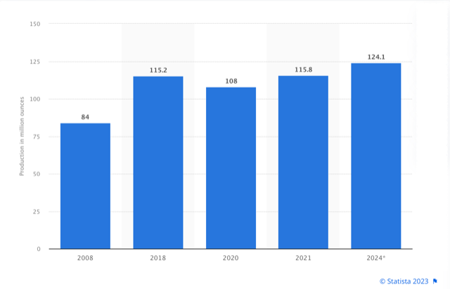 Παραγωγή χρυσού παγκοσμίως από το 2008 έως το 2021 με πρόβλεψη για το 2024 (σε εκατομμύρια ουγγιές)